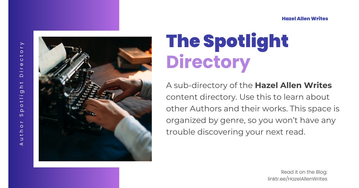 This section contains all of the Spotlights posted on this blog. Use it to learn about various Authors and their works. This space is organized by genre, so you won’t have any trouble discovering your next read (and perhaps your new favorite author).